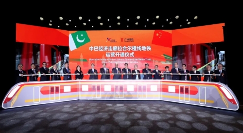 10月25日,巴基斯坦拉合爾軌道交通橙線項(xiàng)目在中國(guó)北京和巴基斯坦旁遮普省首府拉合爾市,以視頻連線方式隆重舉行運(yùn)營(yíng)開通儀式,這標(biāo)志著巴基斯坦駛?cè)氲罔F時(shí)代。國(guó)家發(fā)展和改革委員會(huì)秘書長(zhǎng)趙辰昕,中國(guó)兵器工業(yè)集團(tuán)有限公司董事長(zhǎng)焦開河、總經(jīng)理劉大山、副總經(jīng)理植玉林,巴基斯坦駐華大使莫恩·烏·哈克、巴基斯坦旁遮普省首席部長(zhǎng)薩爾達(dá)爾·烏斯曼·布茲達(dá)爾、中國(guó)駐巴基斯坦拉合爾總領(lǐng)事龍定斌等出席開通儀式。