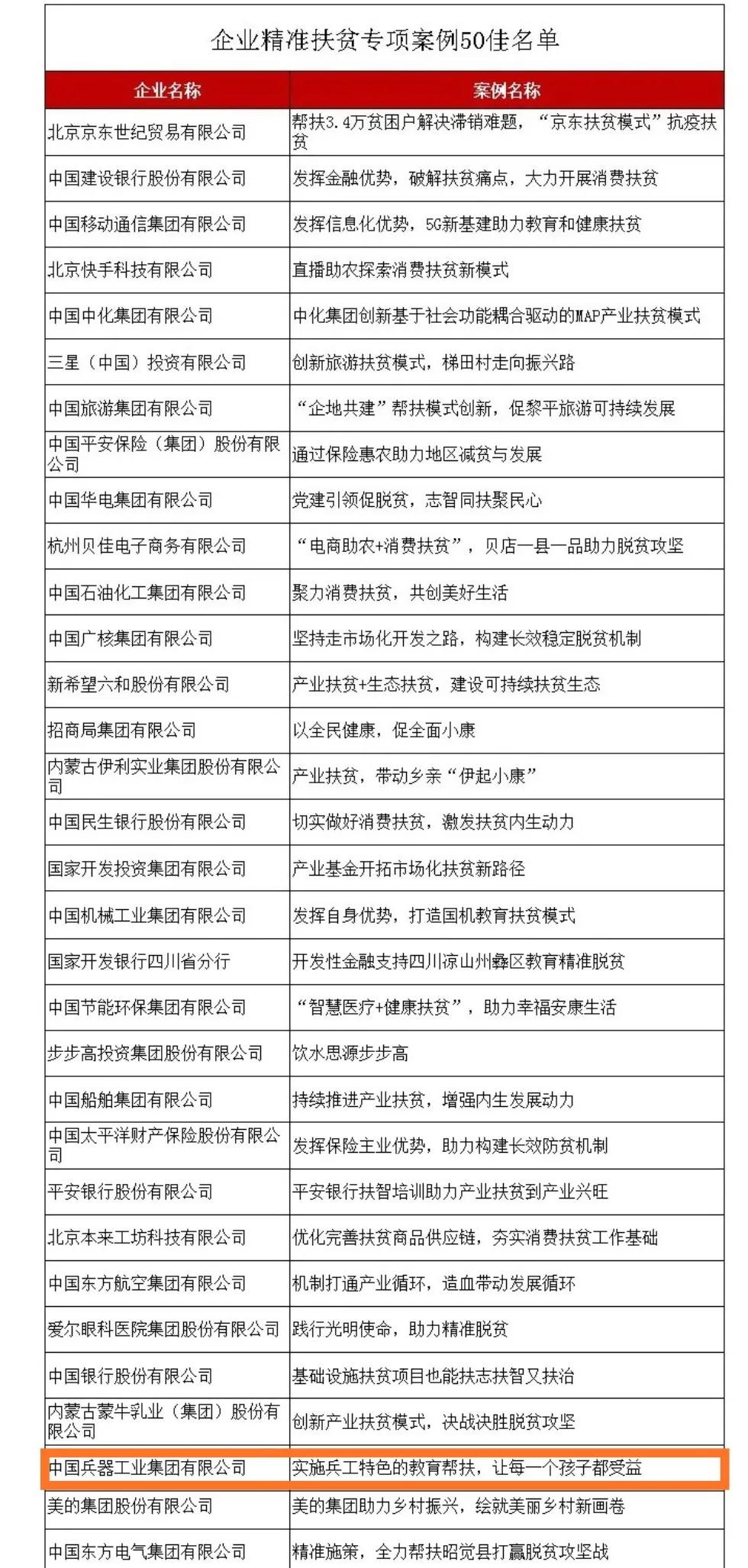 兵器工業(yè)集團(tuán)教育扶貧獲評(píng)國(guó)務(wù)院扶貧辦2020年企業(yè)精準(zhǔn)扶貧專項(xiàng)案例“50佳” |