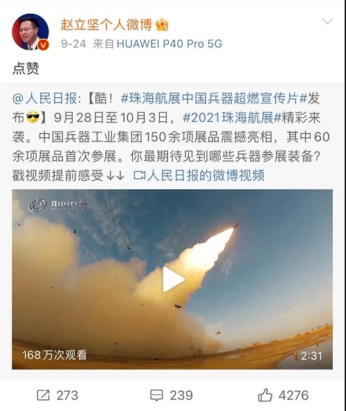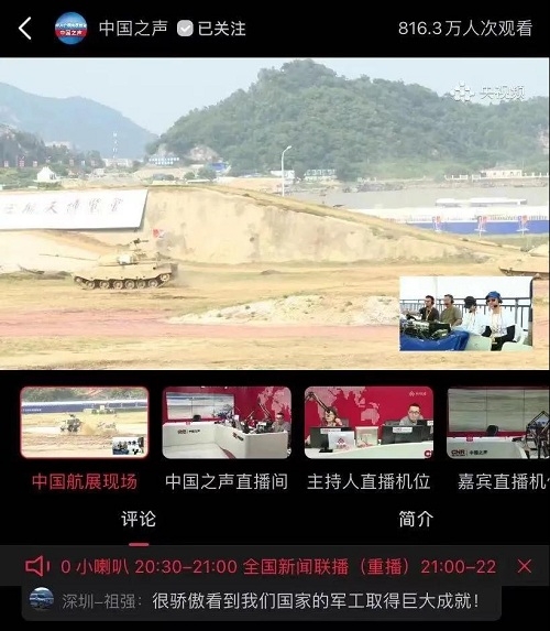 人民日報、新華社、中國日報、共青團中央、國資小新、騰訊軍事、鳳凰軍事、新浪軍事等新媒體發(fā)布的集團公司航展宣傳片等視頻作品燃爆全網(wǎng),閱讀量突破三千萬人次,得到外交部發(fā)言人趙立堅轉載點贊。集團公司微信、微博、抖音號、微信視頻號等新媒體宣傳片播放閱讀量超過400萬人次。同時,央視新聞、新華社、中國之聲、央視軍事、央視新媒體、解放軍報、共青團中央、國資小新、環(huán)球時報等多家媒體對集團公司靜、動態(tài)展區(qū)進行現(xiàn)場直播,在電視端、客戶端、微信視頻號、微博、B站、快手、抖音等平臺受到高度關注。著名軍事專家杜文龍、央視主持人顧國寧、央廣中國之聲主持人王藝等直播兵器館、動態(tài)表演區(qū)裝備。