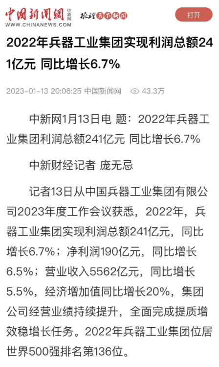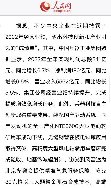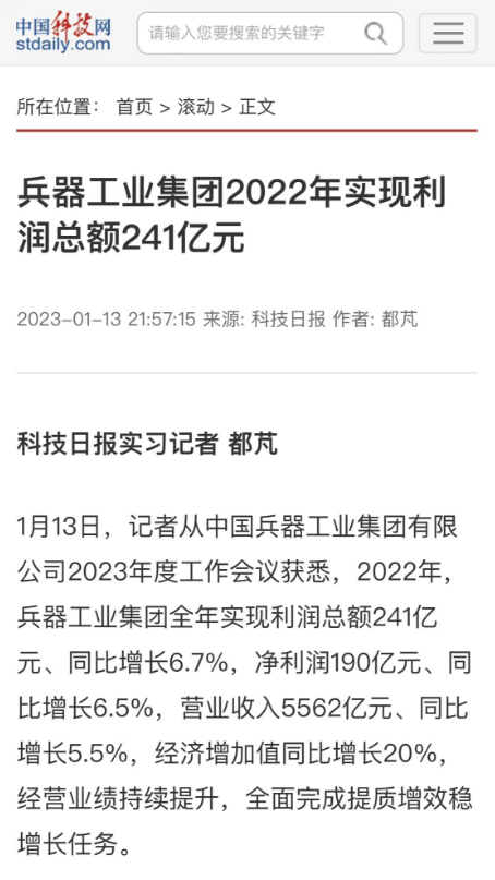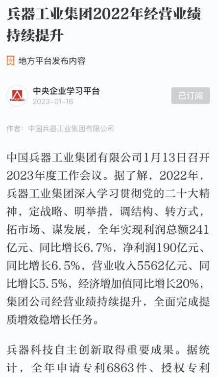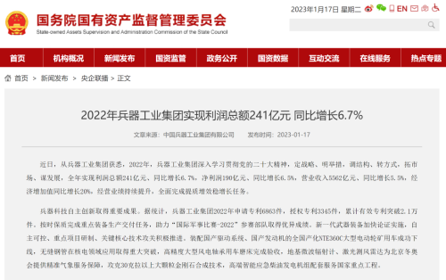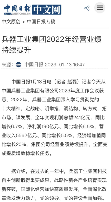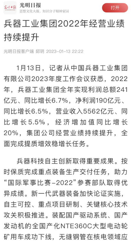 1月13日,中國(guó)兵器工業(yè)集團(tuán)有限公司召開2023年度工作會(huì)議,傳達(dá)學(xué)習(xí)中央領(lǐng)導(dǎo)同志、軍方首長(zhǎng)和上級(jí)部門重要批示,總結(jié)集團(tuán)公司2022年工作,研究部署2023年主要工作任務(wù)。 集團(tuán)公司2022年重點(diǎn)工作取得的成績(jī)及下一步的改革發(fā)展受到社會(huì)媒體廣泛關(guān)注。新華社、新華財(cái)經(jīng)、人民網(wǎng)、經(jīng)濟(jì)日?qǐng)?bào)客戶端、光明日?qǐng)?bào)客戶端、中國(guó)日?qǐng)?bào)網(wǎng)、中國(guó)科技網(wǎng)、中國(guó)新聞網(wǎng)、央廣網(wǎng)、國(guó)資委網(wǎng)站、學(xué)習(xí)強(qiáng)國(guó)中央企業(yè)學(xué)習(xí)平臺(tái)、新浪網(wǎng)、騰訊網(wǎng)、搜狐網(wǎng)、網(wǎng)易網(wǎng)、今日頭條等中央主流媒體、國(guó)家部委網(wǎng)站及知名網(wǎng)絡(luò)媒體對(duì)集團(tuán)公司工作會(huì)議進(jìn)行了報(bào)道,重點(diǎn)關(guān)注集團(tuán)公司高質(zhì)量發(fā)展、科技創(chuàng)新、戰(zhàn)略性新興產(chǎn)業(yè)培育、深化改革、國(guó)際化經(jīng)營(yíng)、履行央企社會(huì)責(zé)任等內(nèi)容。其中新華社以《北斗時(shí)空智能服務(wù)平臺(tái)累計(jì)服務(wù)終端數(shù)突破15億》為題,重點(diǎn)報(bào)道了集團(tuán)公司2022年在自主創(chuàng)新、戰(zhàn)略新興產(chǎn)業(yè)培育、專利申請(qǐng)等方面取得的成績(jī);經(jīng)濟(jì)日?qǐng)?bào)客戶端、光明日?qǐng)?bào)客戶端、中國(guó)日?qǐng)?bào)網(wǎng)等以《兵器工業(yè)集團(tuán)2022年經(jīng)營(yíng)業(yè)績(jī)持續(xù)提升》為題,重點(diǎn)報(bào)道了集團(tuán)公司在高質(zhì)量發(fā)展、全面完成提質(zhì)增效穩(wěn)增長(zhǎng)方面取得的成績(jī)。集團(tuán)公司門戶網(wǎng)站、微信公眾號(hào)、微博等新媒體也對(duì)集團(tuán)公司工作會(huì)議進(jìn)行了及時(shí)報(bào)道,各成員單位紛紛對(duì)相關(guān)內(nèi)容進(jìn)行轉(zhuǎn)載,引發(fā)全系統(tǒng)關(guān)注。 新華社:北斗時(shí)空智能服務(wù)平臺(tái)累計(jì)服務(wù)終端數(shù)突破15億 新華財(cái)經(jīng):兵器工業(yè)集團(tuán)2022年實(shí)現(xiàn)凈利潤(rùn)190億元 同比增長(zhǎng)6.5% 人民網(wǎng):2022年中央企業(yè)營(yíng)收同比增長(zhǎng)8.3% 科技創(chuàng)新成效顯著 經(jīng)濟(jì)日?qǐng)?bào)客戶端:兵器工業(yè)集團(tuán)2022年經(jīng)營(yíng)業(yè)績(jī)持續(xù)提升 光明日?qǐng)?bào)客戶端:兵器工業(yè)集團(tuán)2022年經(jīng)營(yíng)業(yè)績(jī)持續(xù)提升 中國(guó)日?qǐng)?bào)網(wǎng):兵器工業(yè)集團(tuán)2022年經(jīng)營(yíng)業(yè)績(jī)持續(xù)提升 中國(guó)科技網(wǎng):兵器工業(yè)集團(tuán)2022年實(shí)現(xiàn)利潤(rùn)總額241億元 中國(guó)新聞網(wǎng):2022年兵器工業(yè)集團(tuán)實(shí)現(xiàn)利潤(rùn)總額241億元 同比增長(zhǎng)6.7% 國(guó)資委網(wǎng)站:2022年兵器工業(yè)集團(tuán)實(shí)現(xiàn)利潤(rùn)總額241億元 同比增長(zhǎng)6.7% 學(xué)習(xí)強(qiáng)國(guó)中央企業(yè)學(xué)習(xí)平臺(tái):兵器工業(yè)集團(tuán)2022年經(jīng)營(yíng)業(yè)績(jī)持續(xù)提升 集團(tuán)公司職工及廣大網(wǎng)友熱議工作會(huì)議 “這次會(huì)議全面總結(jié)了2022年工作,深入分析研判當(dāng)前形勢(shì),部署2023年重點(diǎn)工作,為我們做好2023年及今后一個(gè)時(shí)期的工作明確了目標(biāo)、堅(jiān)定了信心?!?/p> “作為兵工人,我要苦練內(nèi)功、不懼挑戰(zhàn)、奮勇向前,為建設(shè)具有全球競(jìng)爭(zhēng)力的世界一流集團(tuán)公司貢獻(xiàn)自己的力量。” “聚焦高科技領(lǐng)域,制造更多的大國(guó)重器,讓更多的產(chǎn)品服務(wù)老百姓?!?/p> “在不平凡的2022年取得了亮眼的工作成績(jī),為兵器工業(yè)點(diǎn)贊?!?/p> “希望能有更多新型武器裝備部隊(duì),2023年,望你們?cè)賱?chuàng)輝煌,加油!” |