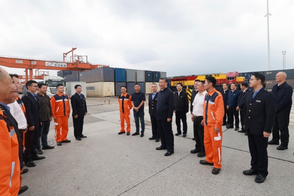 隨后,習(xí)近平來(lái)到重慶鐵路集裝箱中心站,聽(tīng)取貨物集散、運(yùn)輸路徑、運(yùn)營(yíng)成本和效益等介紹,同貨車(chē)司機(jī)、列車(chē)司機(jī)、裝卸工人、場(chǎng)站管理人員等親切交流,詢問(wèn)他們的工作強(qiáng)度、勞動(dòng)保護(hù)、節(jié)假日休息和收入情況。習(xí)近平說(shuō),大家在物流一線,也是在對(duì)外開(kāi)放一線,通過(guò)你們的辛勤勞動(dòng),很多商品跨越山海、走向世界,你們的工作很有意義。推動(dòng)西部大開(kāi)放、促進(jìn)西部大開(kāi)發(fā),物流很重要,大家要繼續(xù)努力,不斷創(chuàng)造新的業(yè)績(jī),作出新的貢獻(xiàn)。