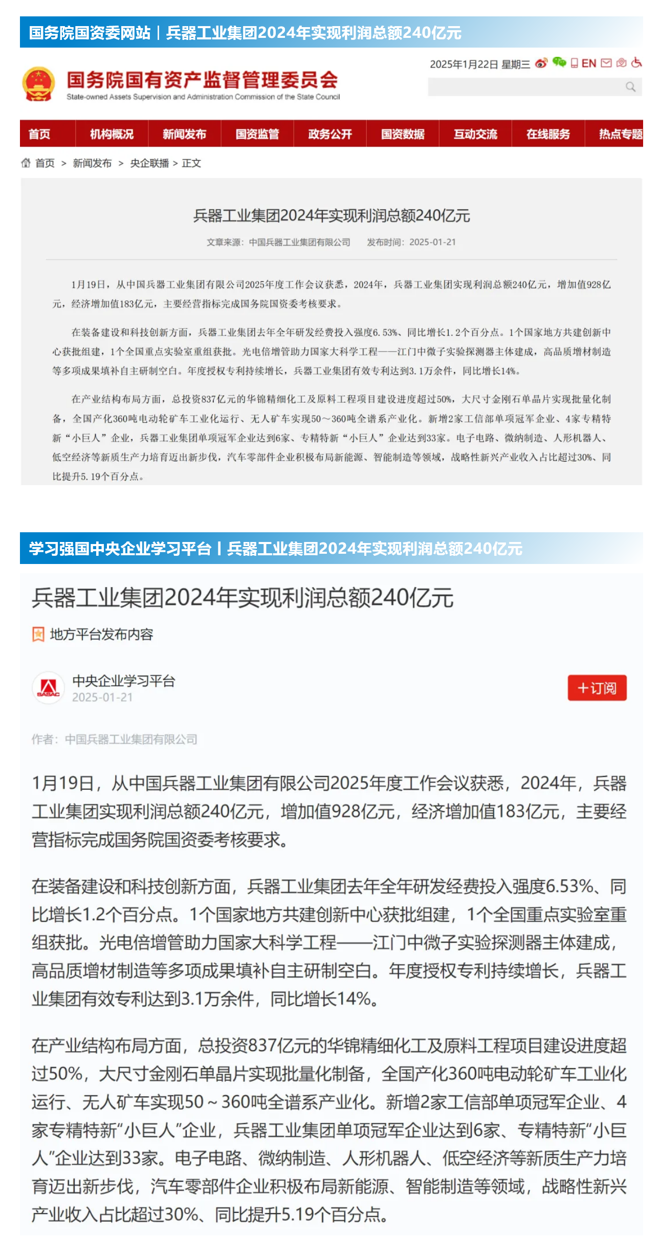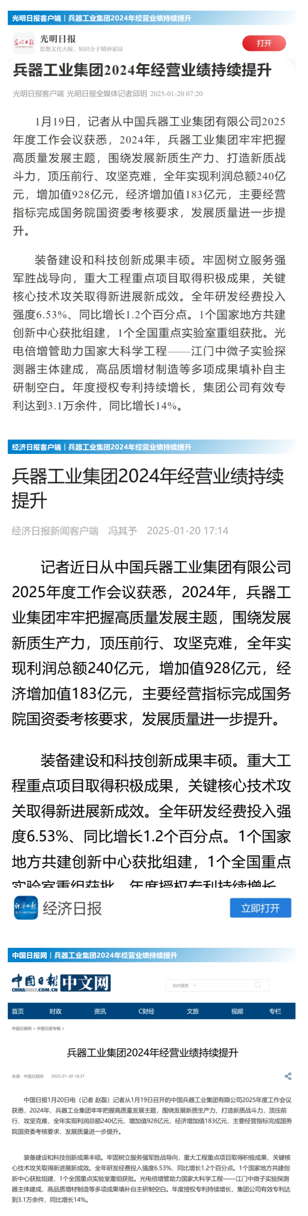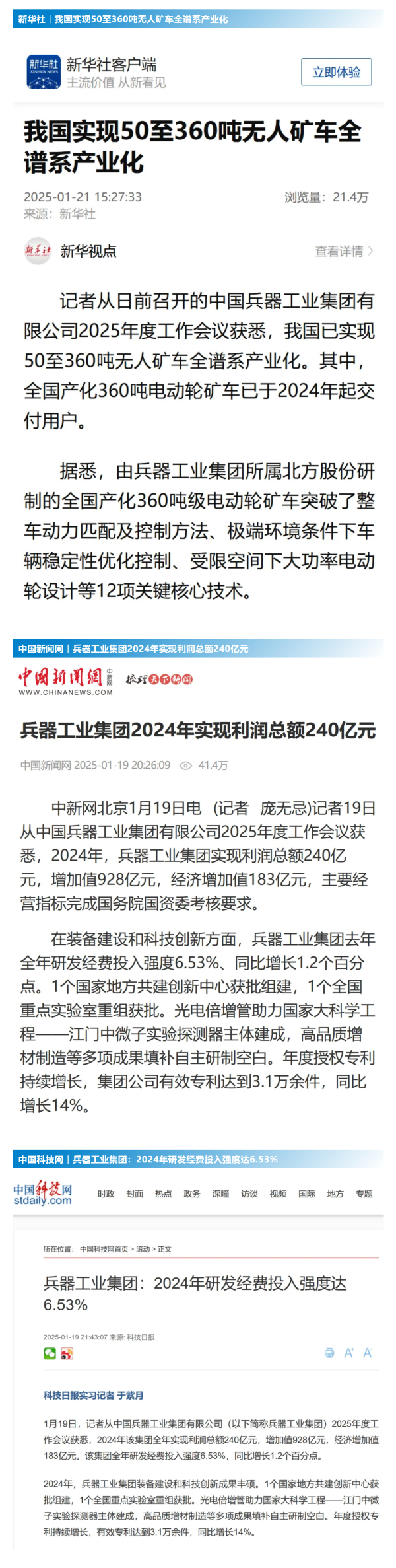 1月19日至20日,中國兵器工業(yè)集團(tuán)有限公司2025年度工作會(huì)議在京召開,會(huì)議總結(jié)2024年工作,分析形勢任務(wù),明確工作思路,部署2025年工作。 集團(tuán)公司2024年取得的成績及下一步重點(diǎn)工作受到社會(huì)媒體廣泛關(guān)注。新華社、中國新聞網(wǎng)、中國科技網(wǎng)、光明日報(bào)客戶端、經(jīng)濟(jì)日報(bào)客戶端、中國日報(bào)網(wǎng)、國務(wù)院國資委網(wǎng)站、學(xué)習(xí)強(qiáng)國中央企業(yè)學(xué)習(xí)平臺(tái)、新浪網(wǎng)、網(wǎng)易網(wǎng)、搜狐網(wǎng)、騰訊網(wǎng)、鳳凰網(wǎng)等中央主流媒體、國家部委網(wǎng)站及知名網(wǎng)絡(luò)媒體對(duì)集團(tuán)公司2025年度工作會(huì)議進(jìn)行了報(bào)道,重點(diǎn)關(guān)注集團(tuán)公司經(jīng)營業(yè)績、科技創(chuàng)新、產(chǎn)業(yè)結(jié)構(gòu)布局優(yōu)化等情況。其中,新華社以《我國實(shí)現(xiàn)50至360噸無人礦車全譜系產(chǎn)業(yè)化》為題,重點(diǎn)報(bào)道了集團(tuán)公司在推動(dòng)智能制造水平提升方面取得的成效;中國新聞網(wǎng)、光明日報(bào)客戶端、經(jīng)濟(jì)日報(bào)客戶端、中國日報(bào)網(wǎng)等就集團(tuán)公司2024年度經(jīng)營業(yè)績及各項(xiàng)工作取得的成果進(jìn)行報(bào)道;中國科技網(wǎng)著重報(bào)道了集團(tuán)公司在科技創(chuàng)新和優(yōu)化產(chǎn)業(yè)結(jié)構(gòu)布局方面的最新進(jìn)展。集團(tuán)公司門戶網(wǎng)站、微信公眾號(hào)、微博等新媒體平臺(tái)以及《中國兵工報(bào)》也對(duì)集團(tuán)公司工作會(huì)議進(jìn)行了及時(shí)報(bào)道,各成員單位紛紛對(duì)相關(guān)內(nèi)容進(jìn)行轉(zhuǎn)載,引發(fā)全系統(tǒng)關(guān)注。 集團(tuán)公司職工及廣大網(wǎng)友熱議工作會(huì) “2025年工作會(huì)為我們指明了發(fā)展方向、明確了奮斗目標(biāo),面對(duì)全新的機(jī)遇和挑戰(zhàn),作為兵工人深感責(zé)任重大?!?/p> “科技是第一生產(chǎn)力,一定要以科技創(chuàng)新引領(lǐng)新質(zhì)生產(chǎn)力發(fā)展,為高質(zhì)量發(fā)展提供支撐?!?/p> “把各項(xiàng)工作做深、做實(shí)、做細(xì),努力為集團(tuán)公司高質(zhì)量發(fā)展添磚加瓦。” “2024年中國兵器展示了大國重器,祝新的一年中再創(chuàng)輝煌!” |