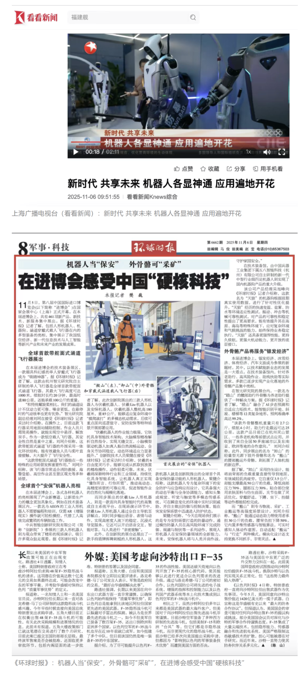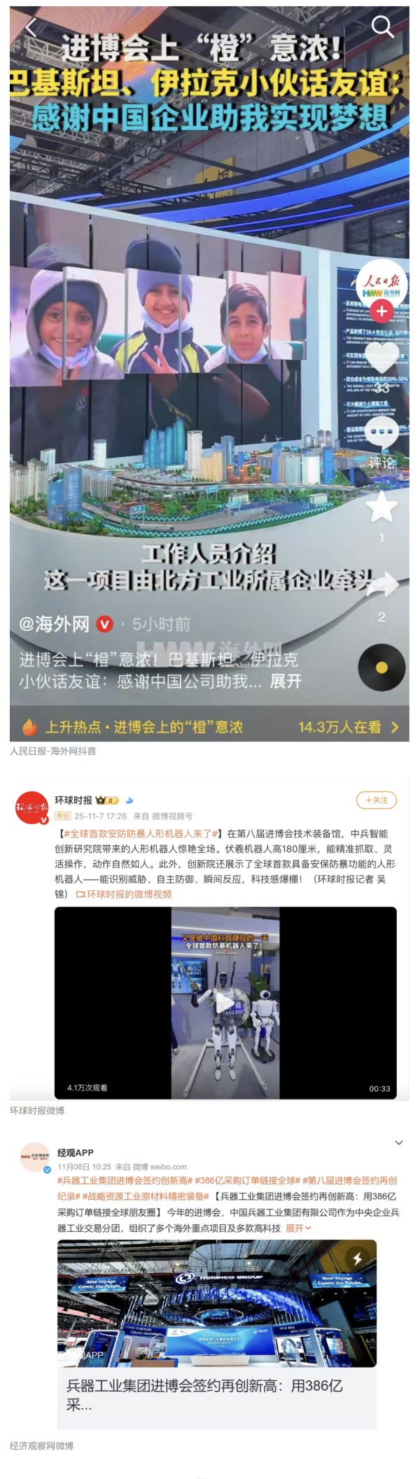 11月5日至10日,中國兵器工業(yè)集團有限公司組團參加第八屆中國國際進口博覽會。集團公司以“堅持合作共贏,推進高水平對外開放,助力構建新發(fā)展格局”為目標,圍繞“新征程,共創(chuàng)未來”主題組團參展,集中展示了一系列新技術、新理念、新成果,取得豐碩成果,受到廣泛關注。 嘉賓云集 本屆進博會上,蒙古國駐華大使、贊比亞礦業(yè)和礦產開發(fā)部常任秘書、津巴布韋首席司長等多國政要蒞臨集團公司組展展區(qū),了解有關項目情況。 國家能源集團、東風汽車、哈電集團、鞍鋼集團、中鋁集團、通用技術集團、中國中車、中國長安汽車、中國電建等央企領導,工信部、國務院國資委、中國貿促會、陜西省、上海市、浙江省等國內政府部門領導以及國內外合作伙伴蒞臨集團公司組展展區(qū)參觀指導。對集團公司高質量共建“一帶一路”,與各國合作伙伴共享發(fā)展機遇、實現互利共贏給予高度評價。 媒體關注 集團公司集中簽約亮相央視綜合頻道《新聞聯播》、央視新聞頻道《朝聞天下》《新聞30分》《共同關注》、央視財經頻道《正點財經》《經濟信息聯播》。 《環(huán)球時報》、環(huán)球網、《新京報》、《中國旅游報》等對集團公司人形機器人、四足機器人、涵道穿戴式載人飛行器、外骨骼等多型新域新質產品,集中亮相進行報道。新華社、央廣中國之聲、新京報(貝殼財經)、上海廣播電視臺等媒體直播探館,打卡兵器“硬核科技”。 人民日報客戶端、新華社客戶端、人民網、中國網、中國日報網、國務院國資委網站、國資小新微信公眾號、國資小新Facebook、學習強國中央企業(yè)學習平臺、經濟觀察網、新京報客戶端等第一時間刊發(fā)集團公司組展簽約、ESG建設等情況。新浪財經、界面新聞等商業(yè)平臺閱讀量累計超500萬次。 在微博、抖音等新媒體平臺上,集團公司高科技產品演示、5D穹幕電影體驗等短視頻持續(xù)引爆流量,累計播放量超800萬次,點贊量破50萬?!氨鞴I(yè)集團進博會簽約386億”相關話題登上微博熱搜榜,閱讀量破5000萬次。 文字丨劉暢 |