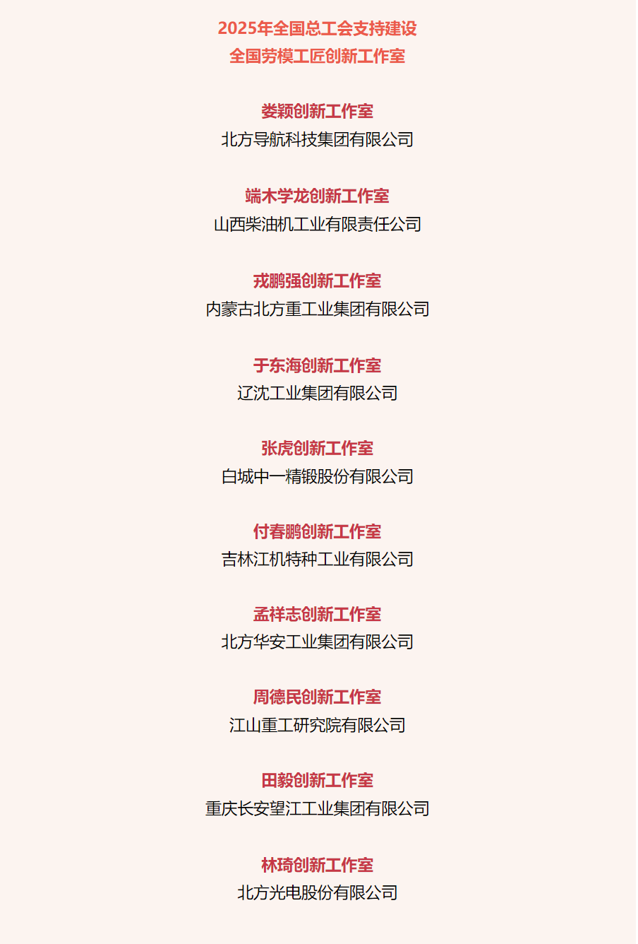 近日,中華全國總工會公布2025年全國總工會支持建設全國勞模工匠創(chuàng)新工作室名單,兵器工業(yè)集團10個勞模工匠創(chuàng)新工作室獲全國總工會支持建設。